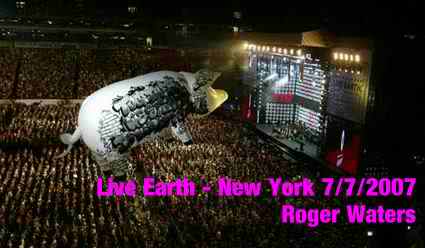 Live Earth, mega evento dell'anno, organizzata dall'ex vicepresidente democratico americano Al Gore, ha attirato l'attenzione di due miliardi di persone sui problemi della crisi climatica, l'inquinamento e contro il surriscaldamento terrestre con 24 ore di musica live suonata nei 7 continenti da piú di 150 musicisti di tutti i generi e tutte le generazioni...Sicuramente avrete giá visto le immagini dei filmati di Roger Waters che ha suonato al Giant Stadium di New York. La sua é stata una partecipazione molto importante, un concerto con i brani piú conosciuti dei Pink Floyd (In The Flesh, Money, Brain Damage, Eclipse, Us And Them, The Happiest Days Of Our Lives, Another Brick In The Wall Part II....). Roger Waters é stato accompagnato dal suo gruppo, dal maiale volante e da un coro di bambini che indossavano una t-shirt con il messaggio "Together We Stand"! Giulia Di Nardo-Spies |