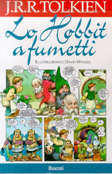 J.R.R. Tolkien David Wenzel ha gia' illustrato altri libri su Tolkien e su molti altri autori di Fantasy. Come citato in fondo al libro : "Il suo stile unisce al tratteggio classico le tecniche di acquerello e la narrazione grafica". La narrazione e l'adattamento a fumetti seguono fedelmente l'originale. Per chi non conoscesse la trama Lo Hobbit narra la storia di Bilbo Baggins, uno Hobbit rispettabile che vive tranquillo nella sua caverna e che viene trascinato, suo malgrado, in pericolose avventure in compagnia di 13 Nani e un Mago (Gandalf) alla ricerca di un tesoro perduto. ( Nota: un Hobbit e' un uomo di piccola statura, proporzionato, non come un Nano basso e tozzo, che vive tranquillo nelle caverne, ma non quelle sotto le montagne, umide come quelle dei nani, bensi' ai piedi delle colline, ariose. La rispettabilita' di Bilbo e' appunto dovuta al fatto di non essere mai stato coinvolto in avventure, e quindi il piccolo Hobbit, alla fine di questa, nonostante tutto, la propria rispettabilità la perderà inevitabilmente, agli occhi degli altri Hobbit) Bilbo, grazie alla mediazione del mago Gandalf, si fa' convincere a partecipare a questa avventura, nella qualita' di Scassinatore. La meta del viaggio e' la Montagna Solitaria, sita al di la' delle montagne nebbiose e del terribile Bosco Atro, e l'obiettivo è cercare di recuperare un tesoro rubato da un Drago ad un avo del capo dei nani, Thorin Scudodiquercia. Durante l'attraversamento delle Montagne Nebbiose, la compagnia viene inseguita dai Goblin (che in altre traduzioni vengono indicati come Orchetti) nei cunicoli di Moria, una citta' sotto le montagne, abbandonata ormai da tempo e Bilbo, perdendosi, fatalmente ritrova un anello che ha la proprieta' di rendere invisibile chi lo indossa. L'episodio di questo ritrovamento sara' la base della trama dell'opera piu' famosa e colossale mai scritta da Tolkien, "Il signore degli Anelli".
